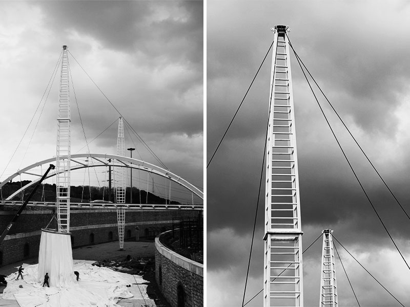 三、支承結構安裝張拉索膜結構的支承可分為剛性邊界和柔性邊界。支承結構安裝誤差的大小,不僅直接影響建筑的外觀,還影響結構內預應力的分布,嚴重者將影響結構的安全性。在安裝支承鋼結構前,應按規范和設計要求對鋼結構基礎的頂面標高、軸線尺寸做嚴格的復測,并作復測紀錄。支承結構安裝工藝流程為:鋼結構預埋交底→鋼結構預埋→鋼結構制作→基礎預埋復核→構件防腐涂裝→構件防火涂裝→構件吊裝。
