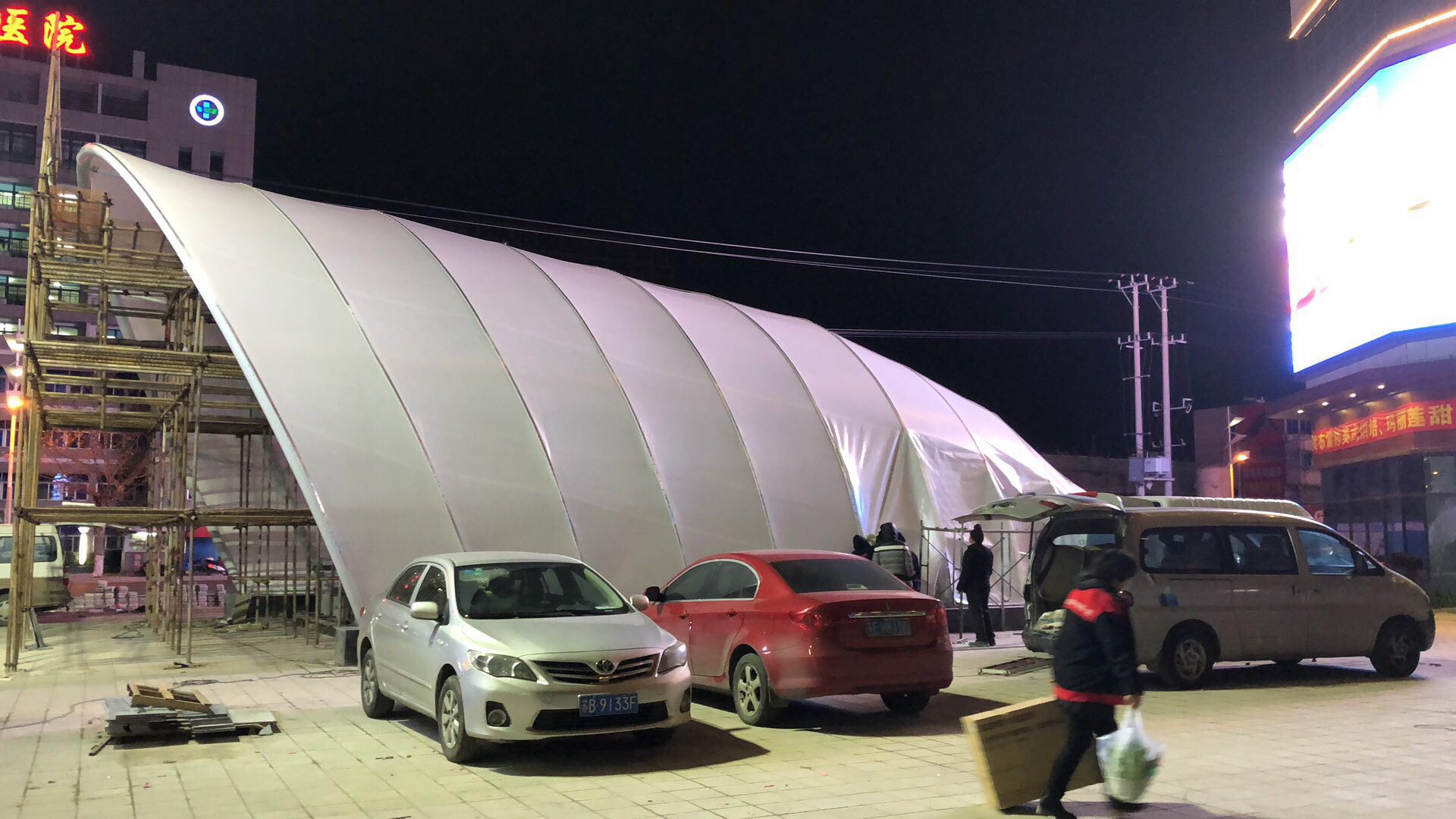 三、膜體安裝膜體進場安裝前,應組織項目有關人員對施工方案進行評審,確定詳細的安裝作業與安全技術措施。先復核支承結構的各個尺寸,使每個控制點的安裝誤差均在設計和規范允許的范圍內;對膜體及配件的出廠證明、產品質量保證書、檢測報告及品種、規格、數量進行驗收;檢查膜體外觀是否有破損、褶皺,熱熔合縫是否有脫落,螺栓、鋁合金壓條、不銹鋼壓條有無拉傷或銹蝕,索和錨具涂層是否破壞。在組織驗收構件的同時,還應根據場地條件和施工方案搭設膜體展開平臺,安裝安全網。對大型的張拉膜結構,要收集安裝期間的氣象信息。安裝過程中要密切注意風向和風速,避免膜體發生顫動現象。在強風或大雨天氣要及時停止施工,并采取相應的安全防護措施。